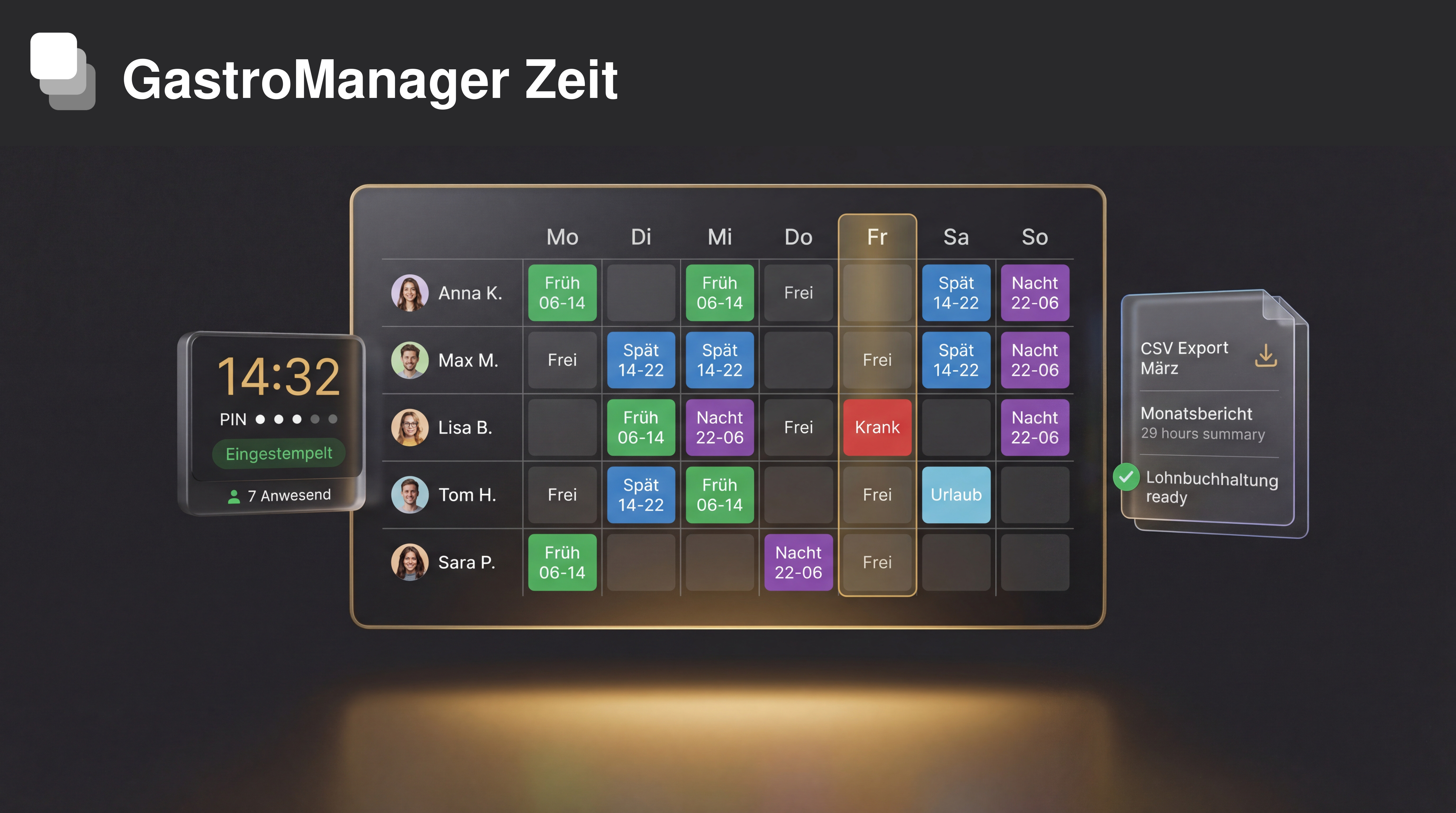 Schichtplanung, Zeiterfassung, Aufgaben — alles in einem System. Endlich kein Papierchaos mehr im Team.